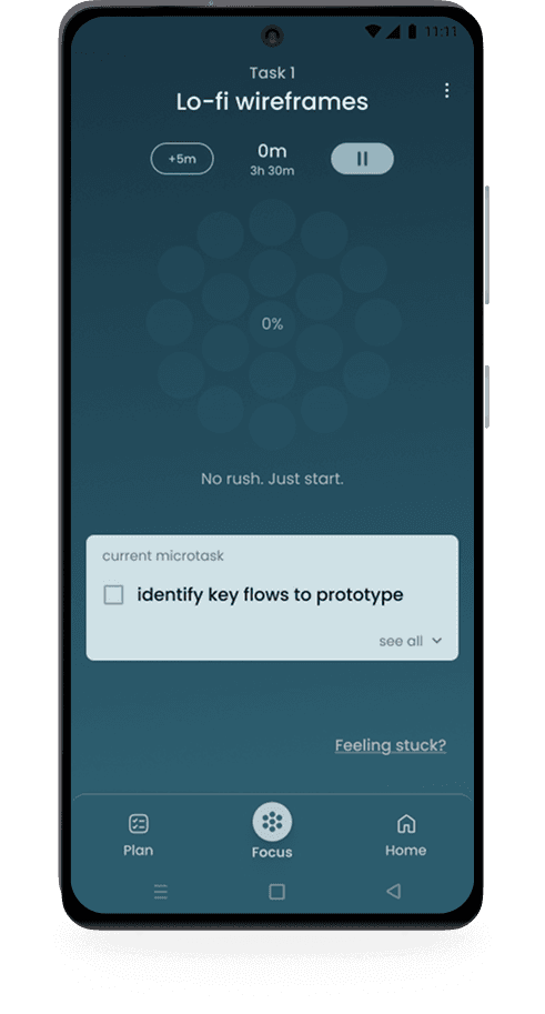 Once users enter Focus Mode, a subtle progress visualization sits at the top of the screen - bold in shape, slow-moving by design - giving users a peripheral sense of momentum without pulling focus. The current microtask occupies the visual center, set in light color against a dark background to draw the eye naturally. Gentle motivation messages shift as progress continues (no rush / just start / still on track...), present enough to encourage, subtle enough not to distract.