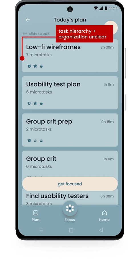 problems: - users were unclear how tasks were being organized - users weren’t sure which task to start with due to limited visual hierarchy solutions: - added an explanatory modal to clarify the system - visually emphasized the top priority task for the day