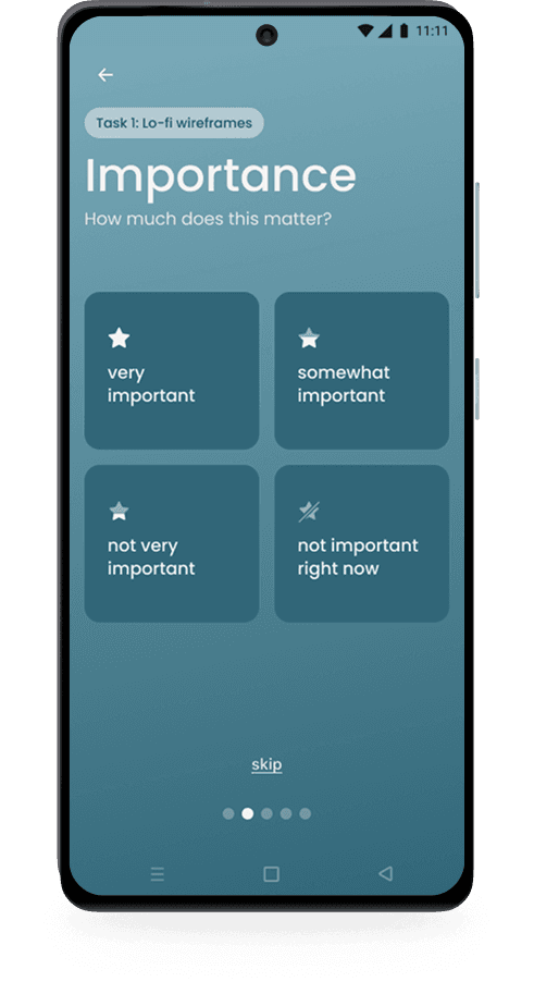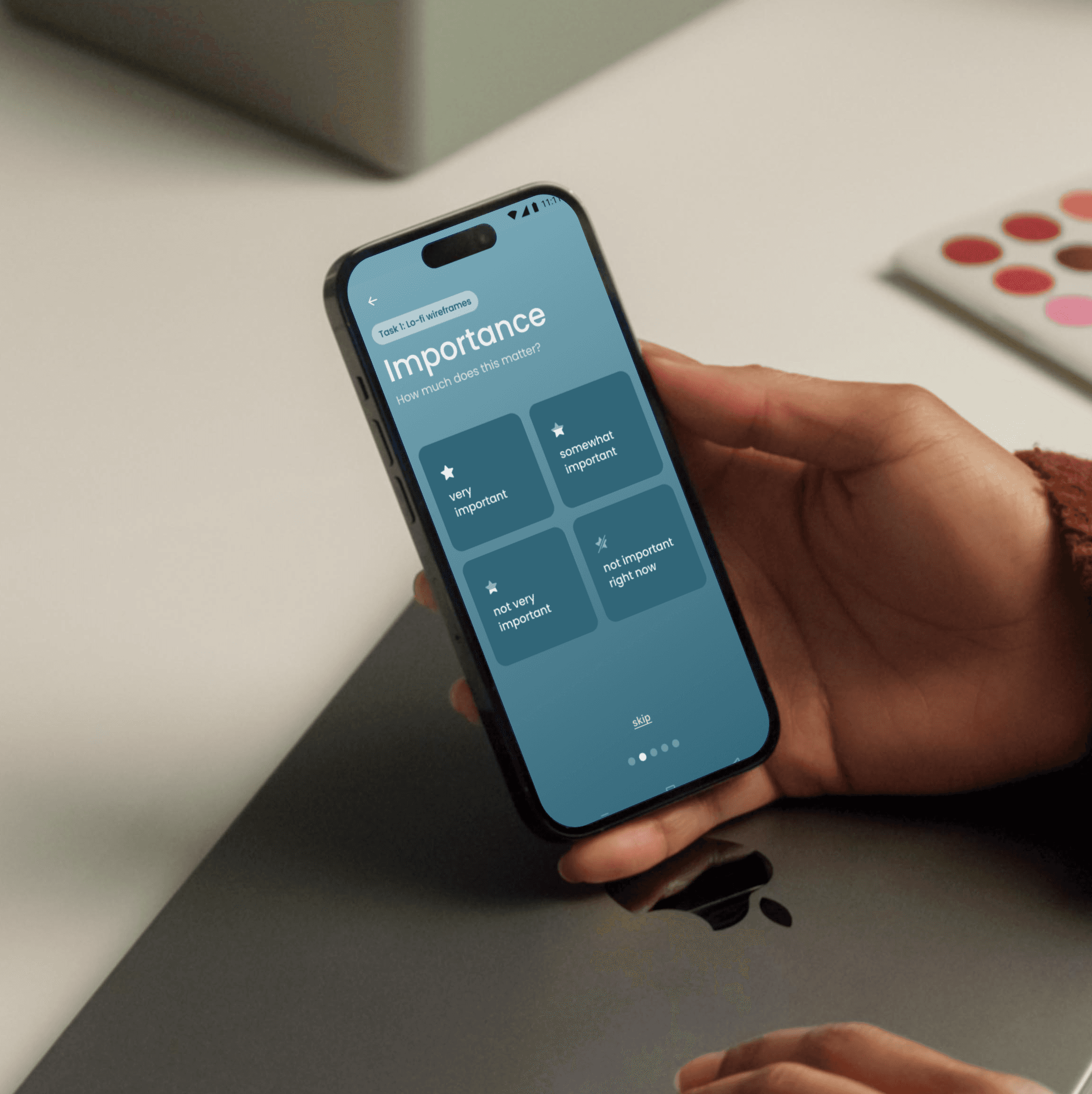 My first version asked users to fill in all task details on one screen: urgency, importance, energy, estimated time. Early feedback made clear this replicated the exact overwhelm I was trying to eliminate. I moved to a one-question-per-screen model, keeping each input fully focused and distraction-free.