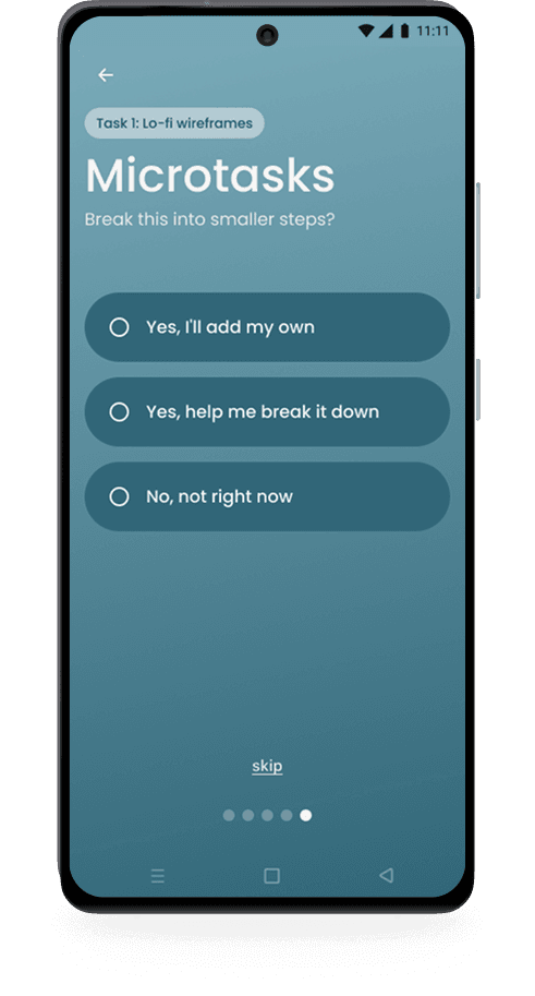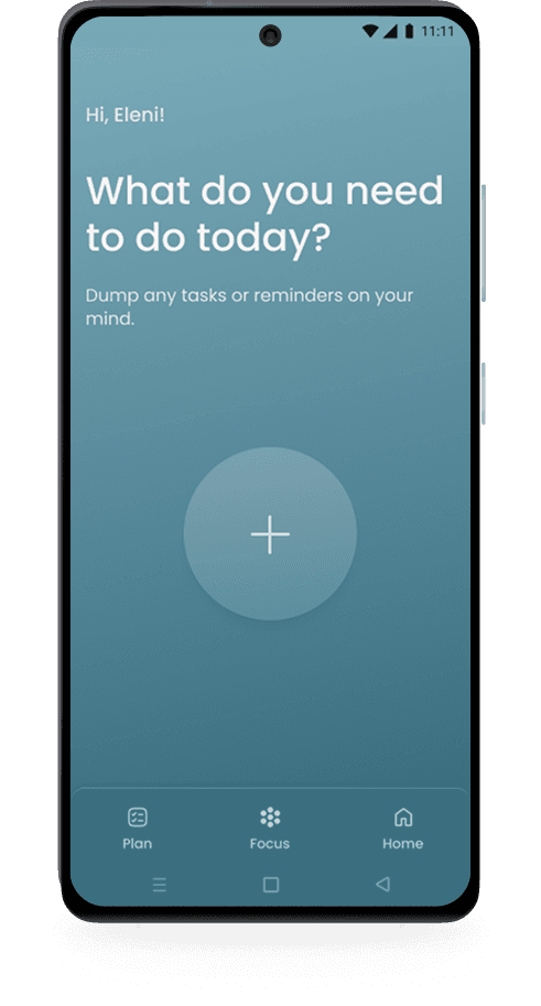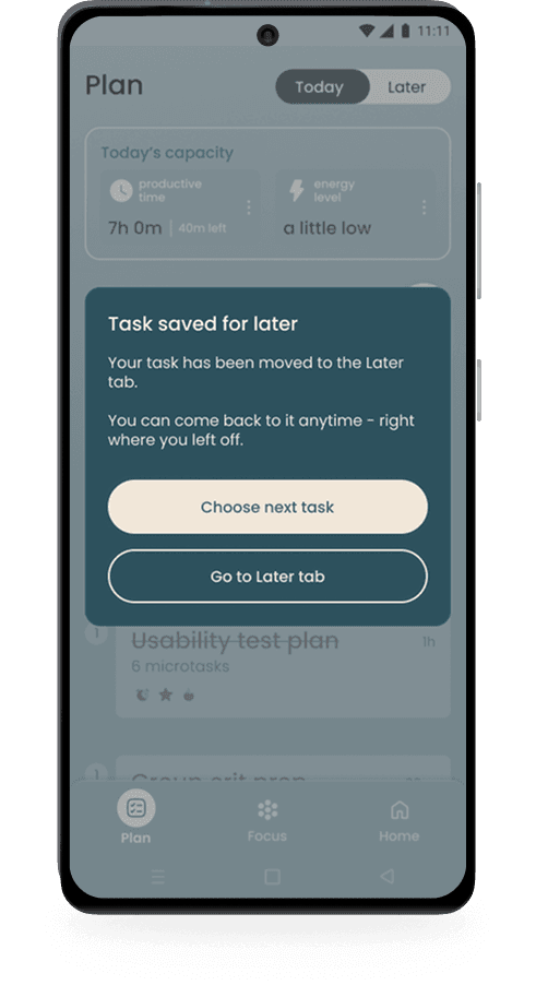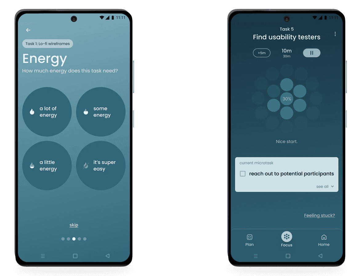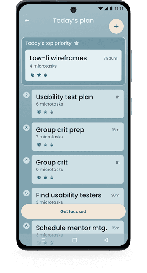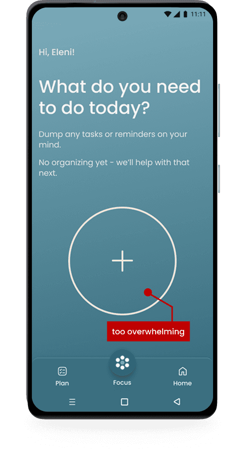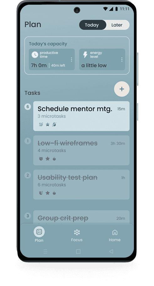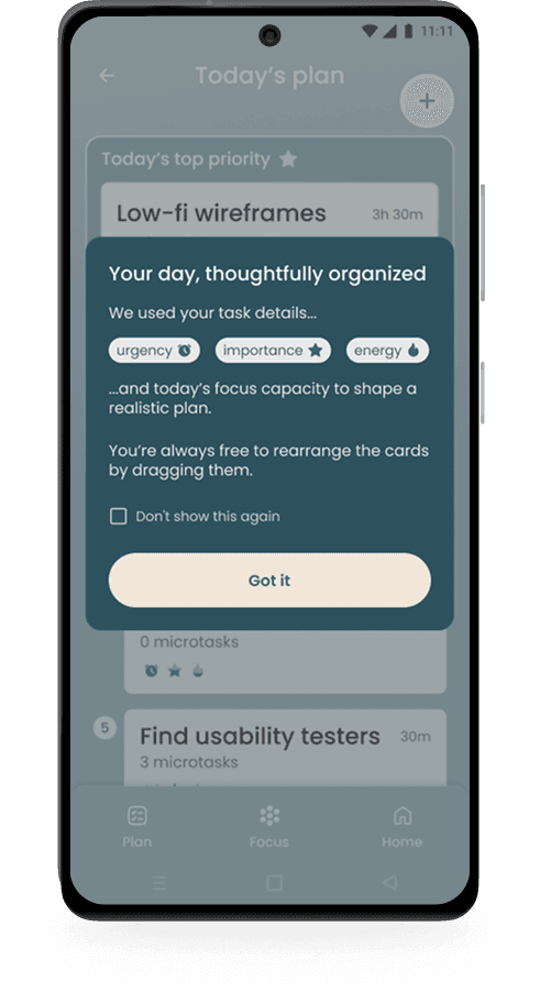 Users begin by unloading everything that’s been floating around in their head, adding light details to each task (urgency, importance, energy, and time) only if it feels helpful. They also have the option to break tasks into microtasks or skip ahead to Focus Mode entirely.