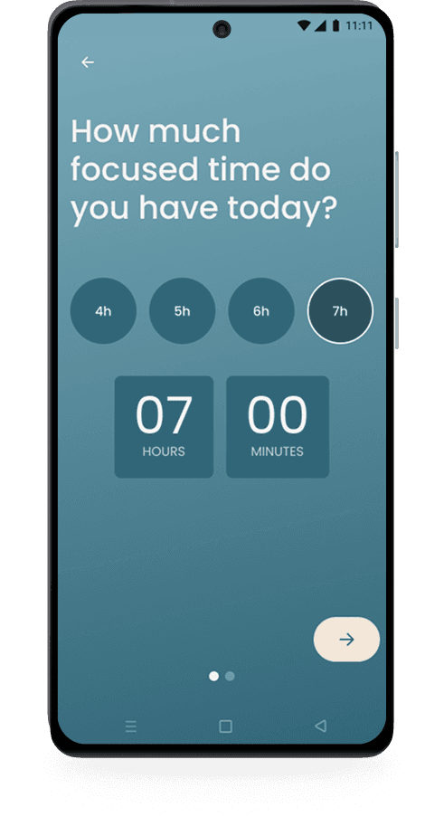 From there, users check in on their available time and energy for the day. The system uses this context to generate a realistic plan and surface the single most relevant task to start, leading naturally into Focus Mode.