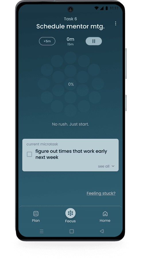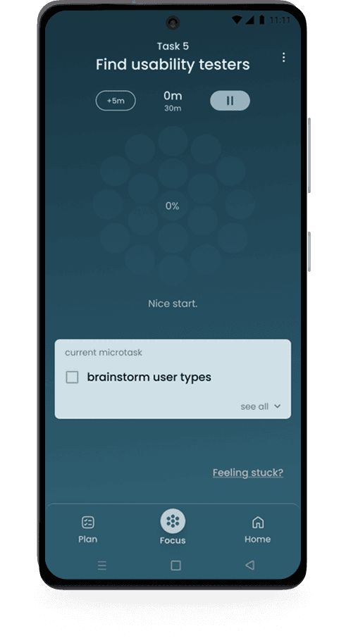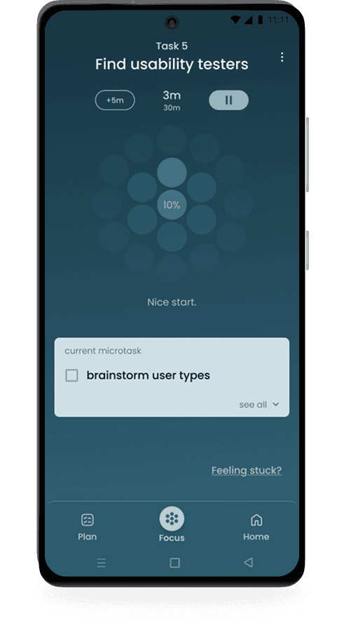 Focus Mode removes distractions by surfacing only the current microtask, using a calmer visual palette, positive time framing, and subtle progress feedback to support sustained focus and momentum.