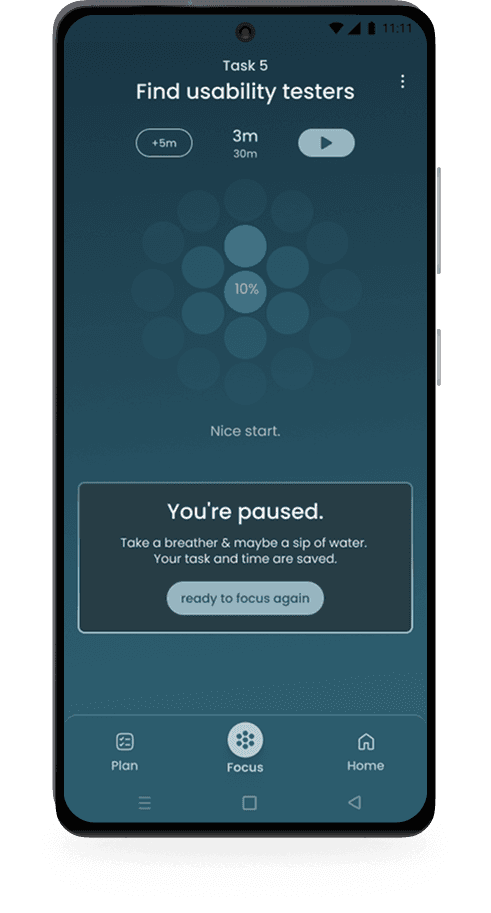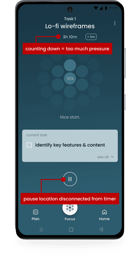 problems: - viewing only the remaining time increased pressure - the pause button felt visually disconnected from the timer solutions: - reframed time as elapsed to promote encouragement - moved the pause control closer to the timer for easier, calmer access