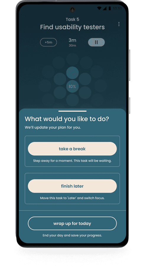 If overwhelm arises, the pause button surfaces three options ordered from least to most disruptive: take a break, finish later, or wrap up for today. The third option uses a secondary button style (visually quieter) to gently discourage closing the app without removing the choice.