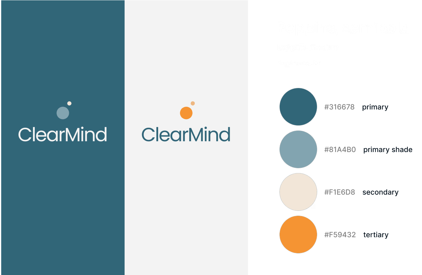 The name ClearMind reflects the app's core goal: moving from mental clutter to clarity. The logo suggests a head with a lighter thought rising outward - a visual metaphor for mental release. The color palette supports focus and emotional regulation, and typography was chosen for warmth and readability above all else.