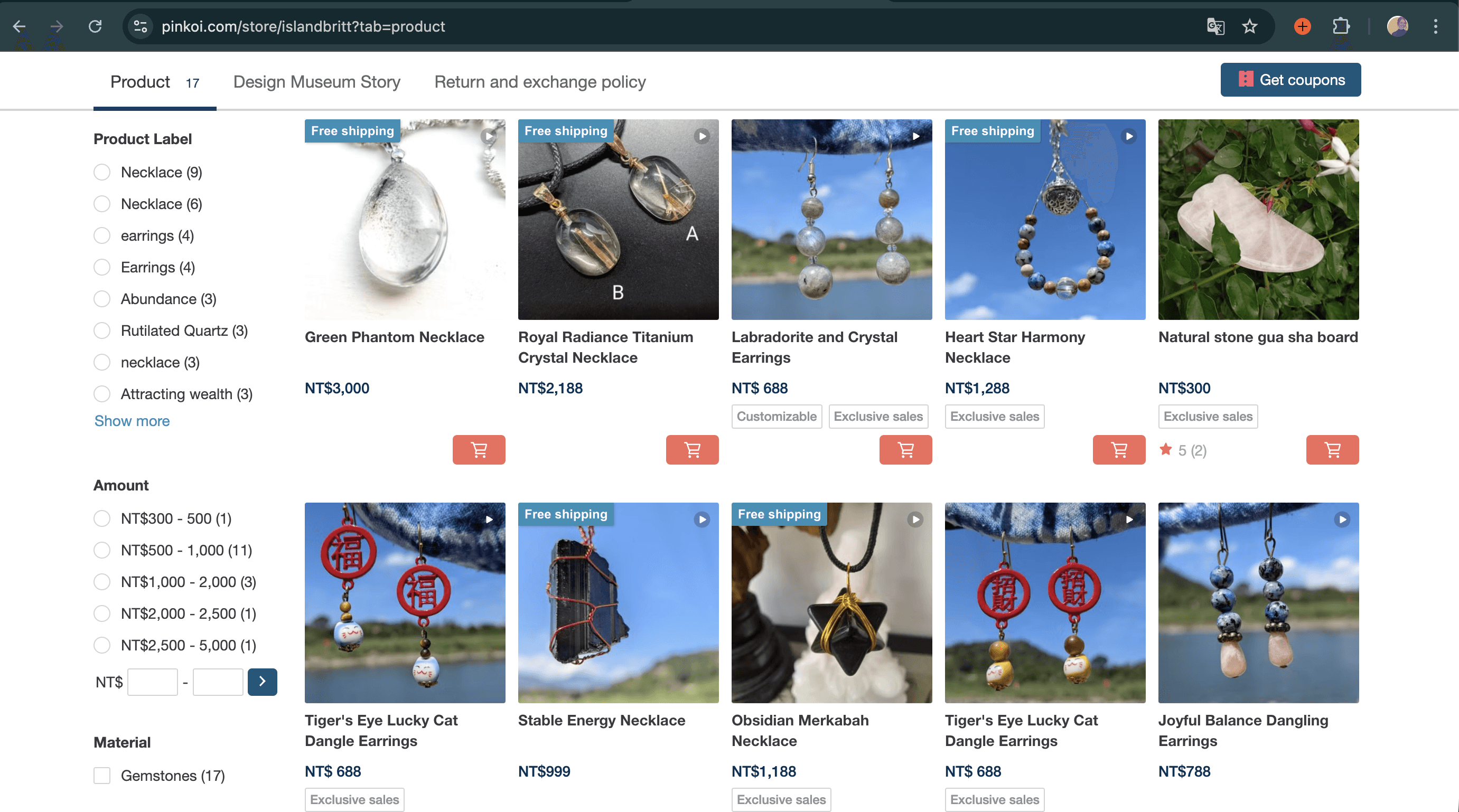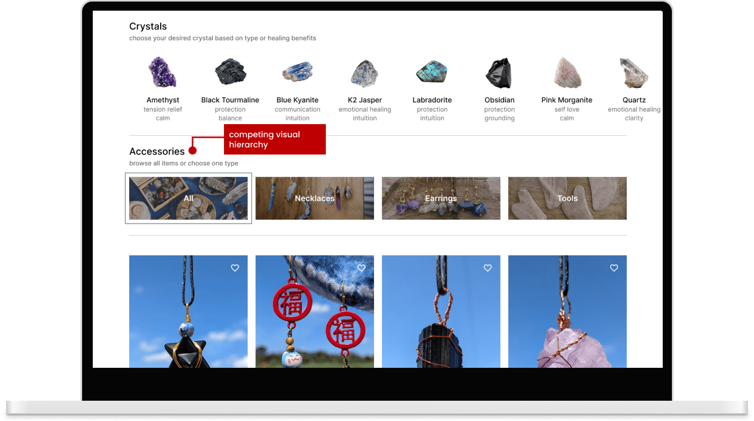 I moved to horizontal filters at the top of the page. My first version had two rows (crystal type and jewelry type) but this created its own cognitive load. I simplified to one primary row of visual crystal tiles and moved jewelry type filtering to the top navigation.