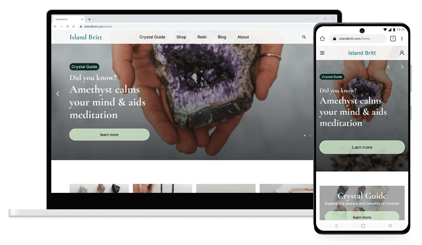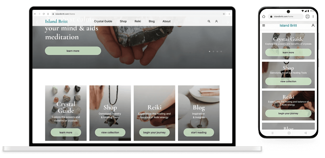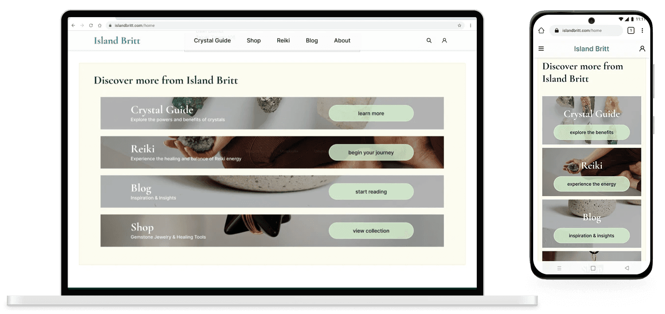 And in the shopping flow featured below, a row of benefit-style cards circulated users through Britt's broader offerings: her story, crystal education, Reiki services, and her crafting process. Each card has a clear CTA, keeping the experience connected without overwhelming the primary shopping flow.