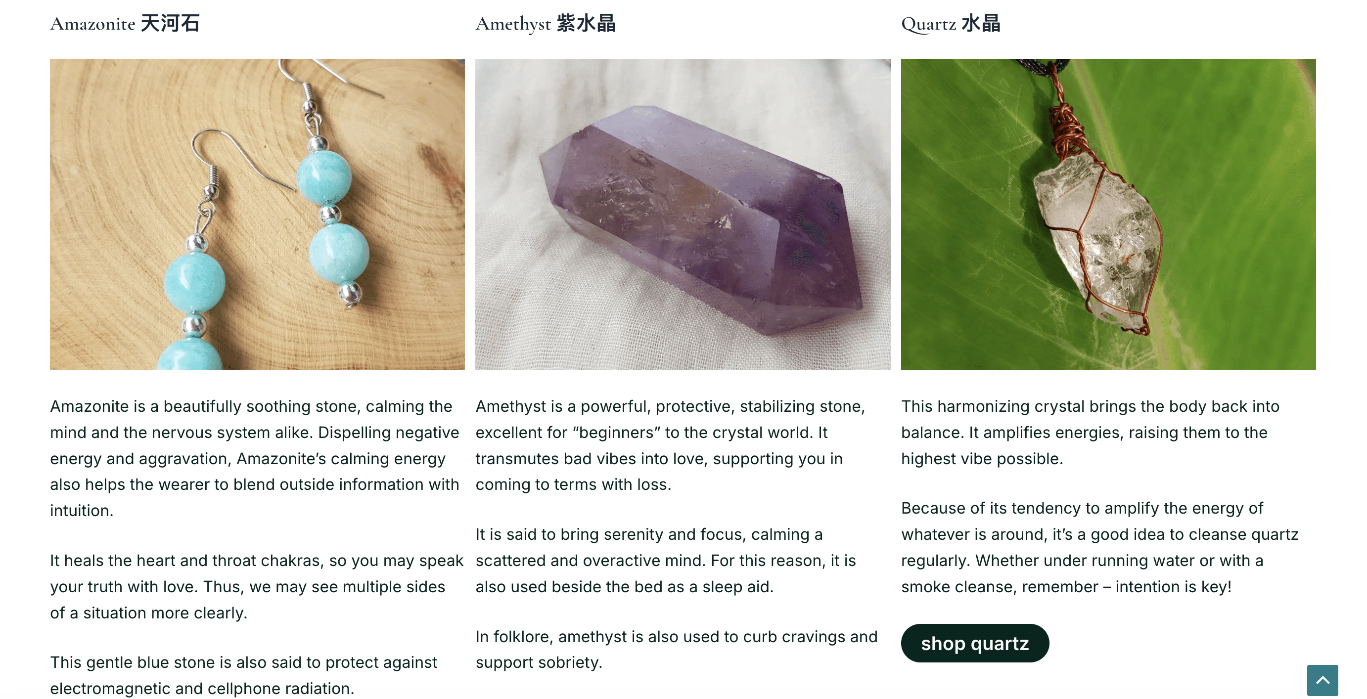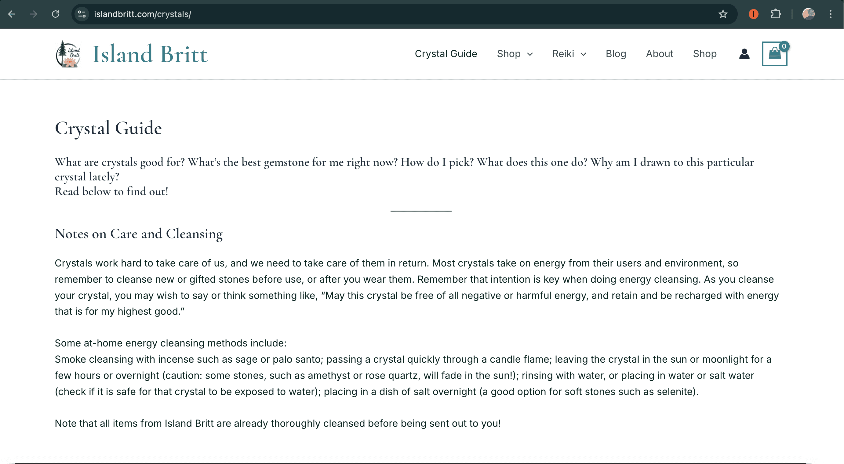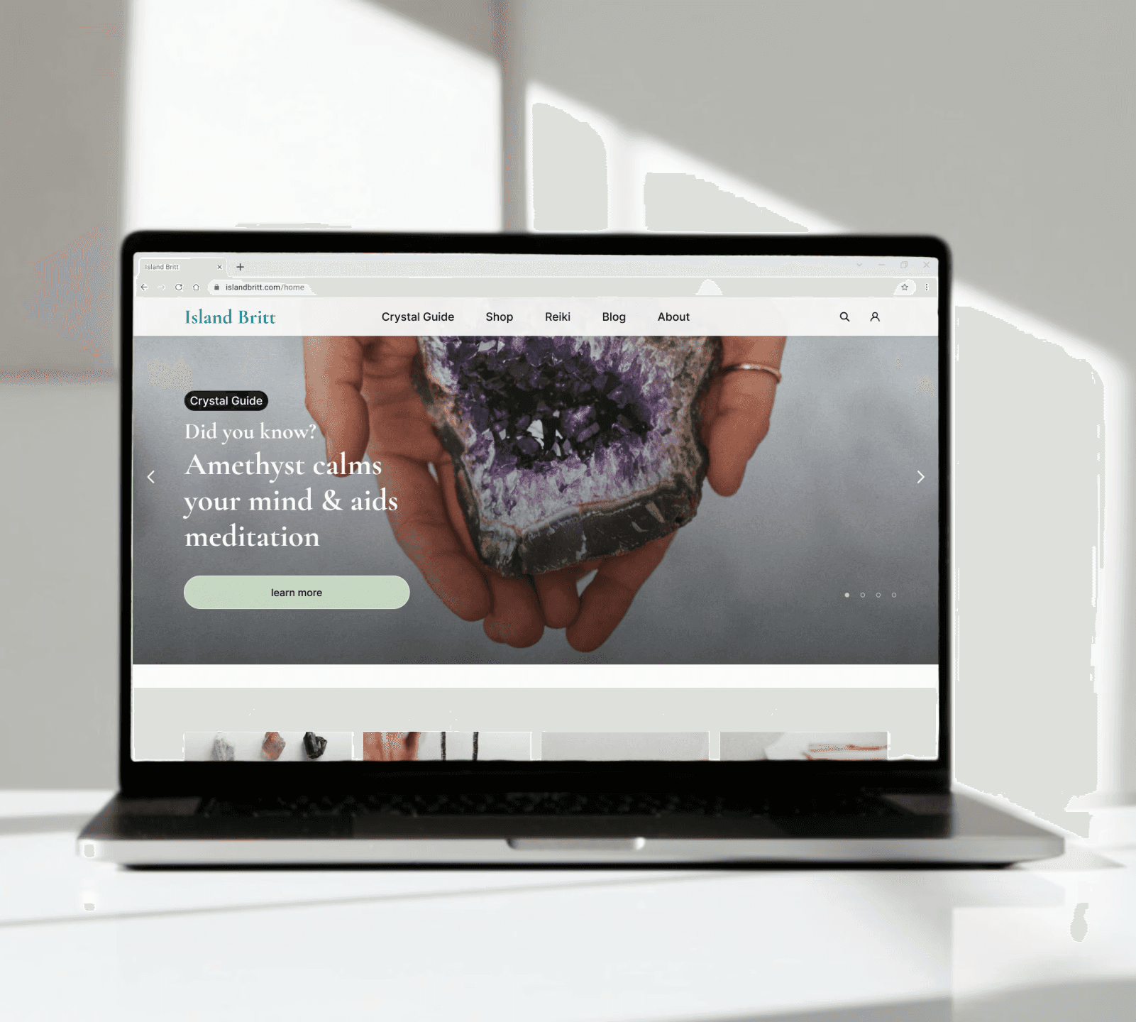 And in the shopping flow featured below, a row of benefit-style cards circulated users through Britt's broader offerings: her story, crystal education, Reiki services, and her crafting process. Each card has a clear CTA, keeping the experience connected without overwhelming the primary shopping flow.