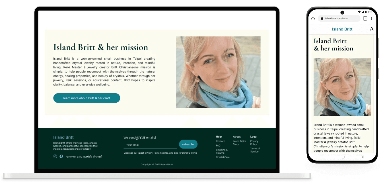 After aligning with Britt on priorities, product discovery and crystal education took the front seat. Her story was important but secondary - enough of it needed to live on the homepage to build connection, with a full About page deferred to a future phase.