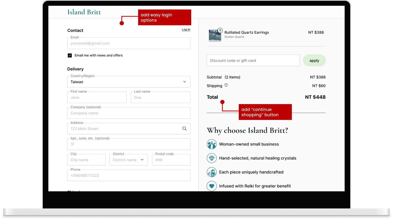 The most consistent challenge was working within the rhythms of a real client relationship. Island Britt is a passion project alongside a demanding day job, which meant momentum naturally ebbed and flowed. The project is currently paused while I wait for the opportunity to transfer the Figma design to her WordPress site. The harder design challenge was working around missing assets. Users consistently asked for product imagery showing pieces to scale and being worn, as well as short videos from multiple angles - both meaningful trust-building elements in e-commerce. Britt understood their value, but creating them wasn't within her bandwidth at this stage. Working with assets outside your control is a real tension in client work. In future projects I'd establish clear asset expectations upfront - a small conversation that saves significant friction mid-project.
