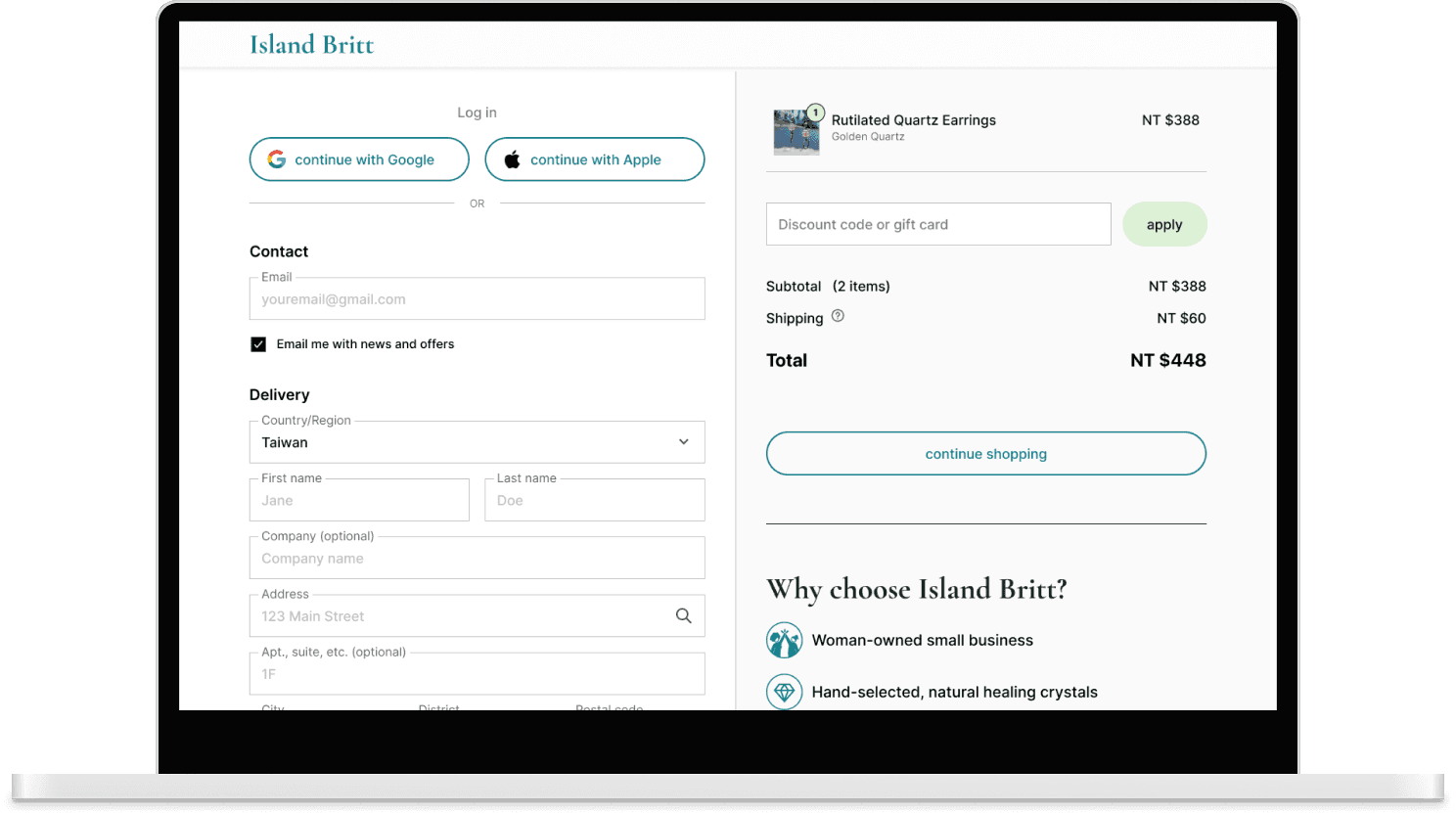 Problem: The checkout page made logging in and continuing to browse feel cumbersome. Solution: Google and Apple login options were added for faster sign-in, along with a "Continue Shopping" button to encourage last-minute exploration before completing a purchase.